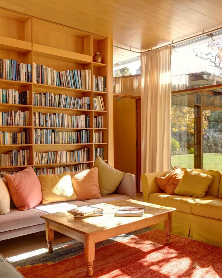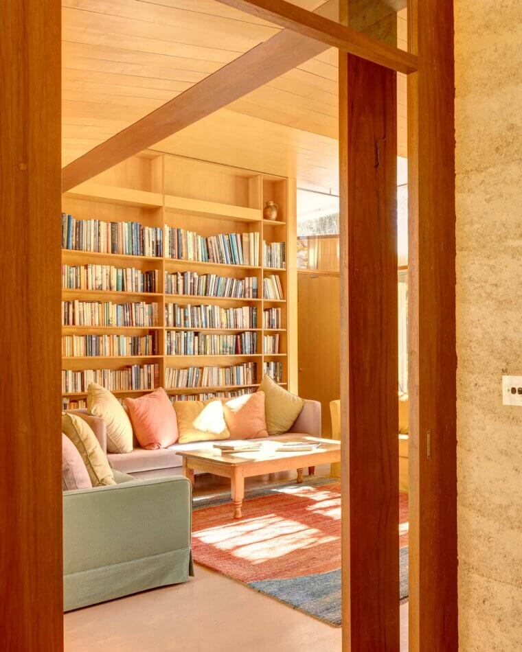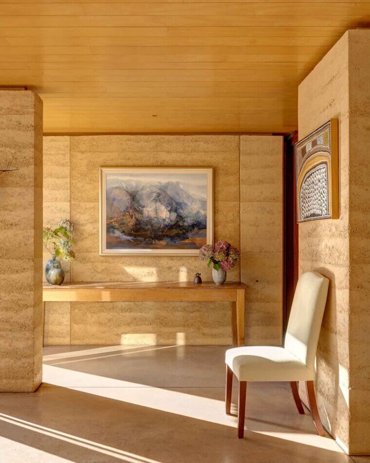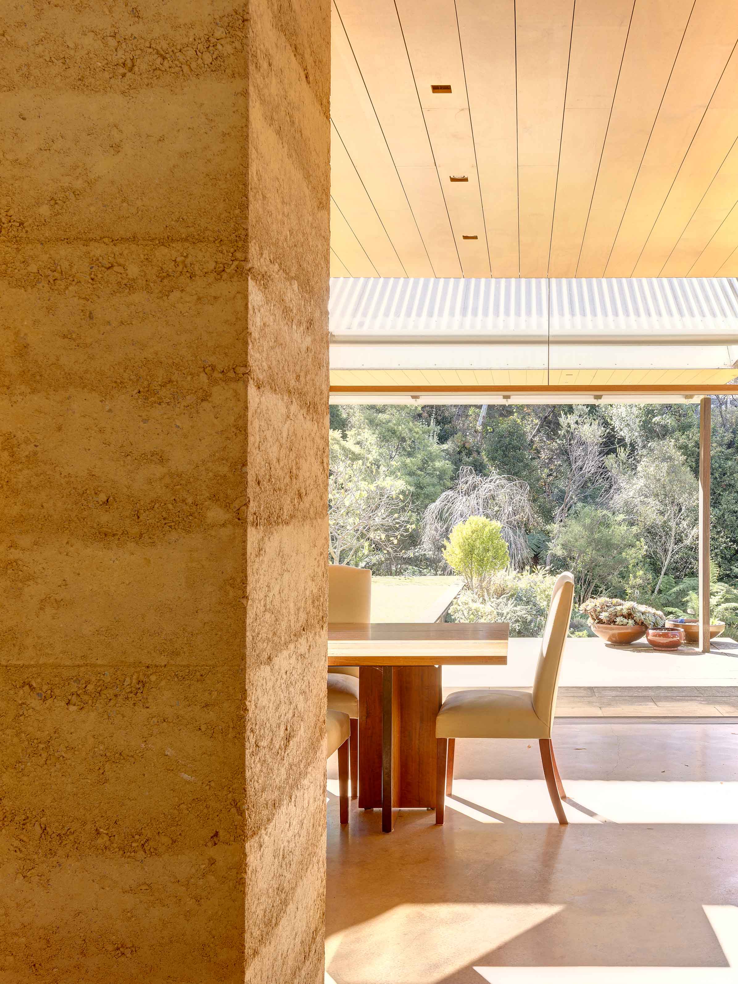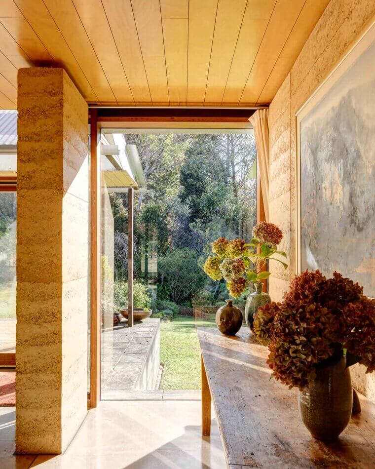The new, Stockwell-designed house stands in direct contrast to the timber cottage in all senses – long and low and L-shaped, its internal spine is of rammed earth, consisting of crushed sandstone mixed with a small amount of cement and chips of ironstone and quartz. As in the cliffs of the Mountains, the rammed earth wall, precise in its construction and golden in colour, seems to glow at certain times of day, bringing a sense of warmth to the entire house.