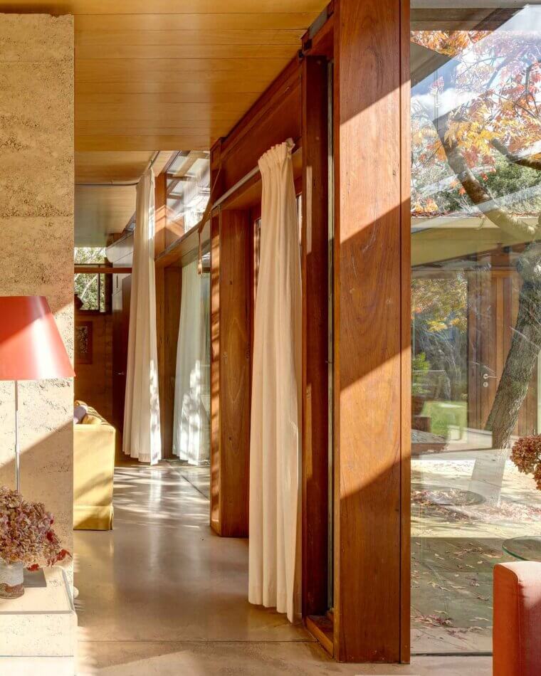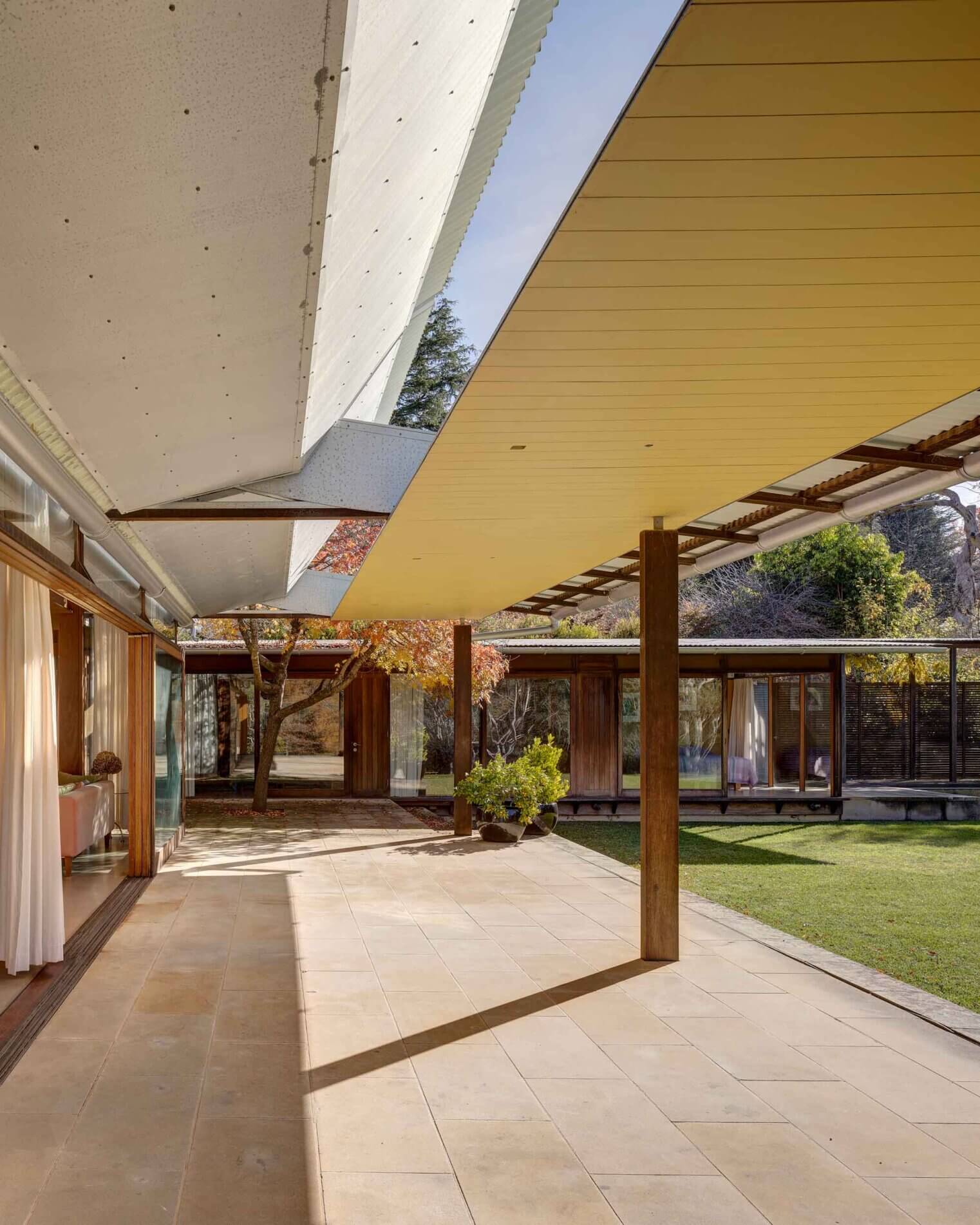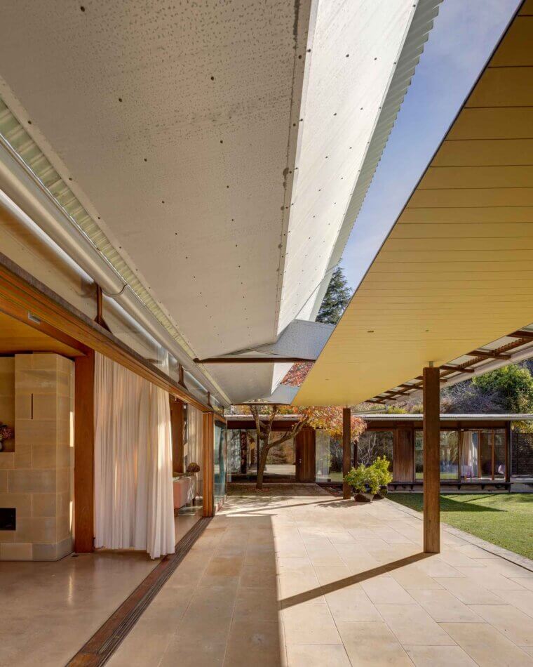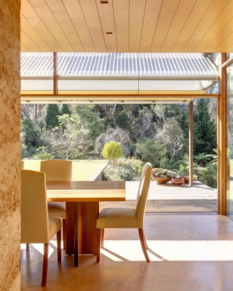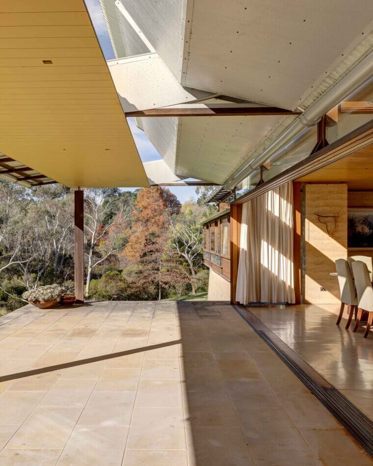 For the original owners, it was essential that the house be light year-round. To achieve this, the architect came up with an ingenious solution – a simple pulley system controls the pitch of the verandah blade roof adjusting the amount of light. The easy-to-operate rotating blade roof for the verandah, which allows the living rooms to be flooded with winter sun-light but, in its closed position, provides protection from the summer sun.