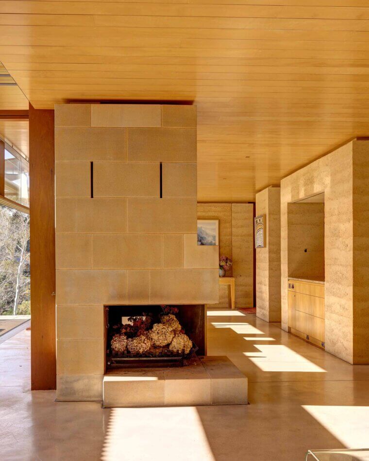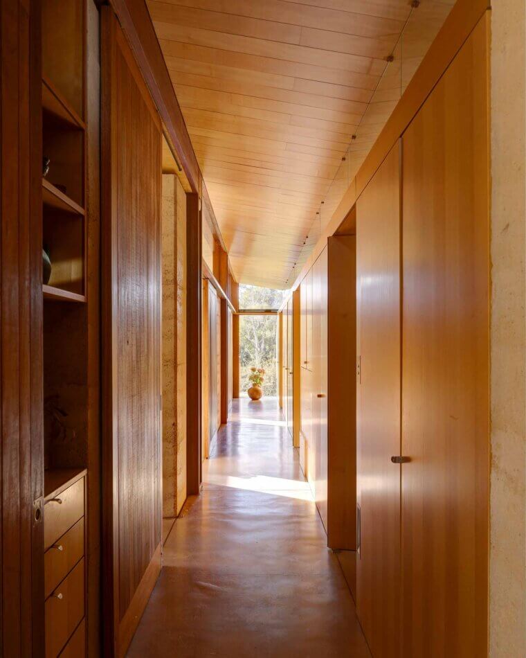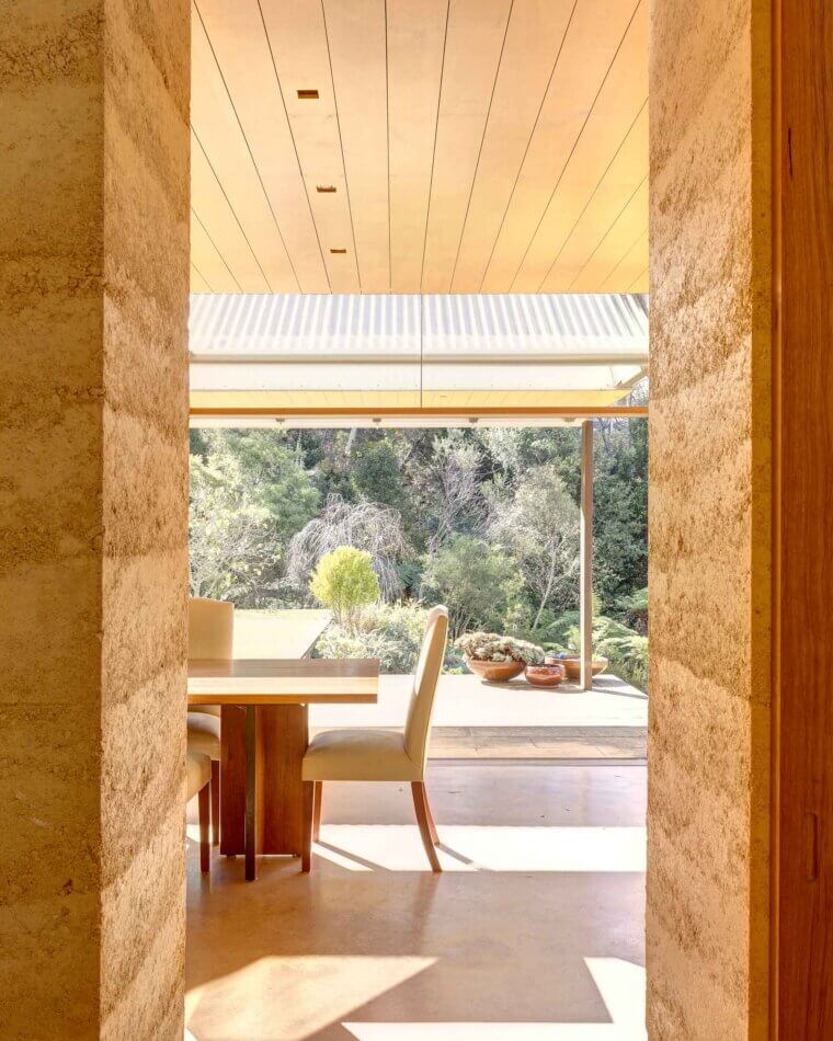 Its capacity to retain heat in winter and remain cool in summer, the rammed earth is an ideal response to the brief which expressed the wish for a passive solar design. It also directly addresses the request for a house that would, in some way, reflect the cliffs of the Blue Mountains. The strength and innate power from the verticals is palpable, giving the structure a presence that mirrors the towering cliffs, grounding the home in both its design and its environment.