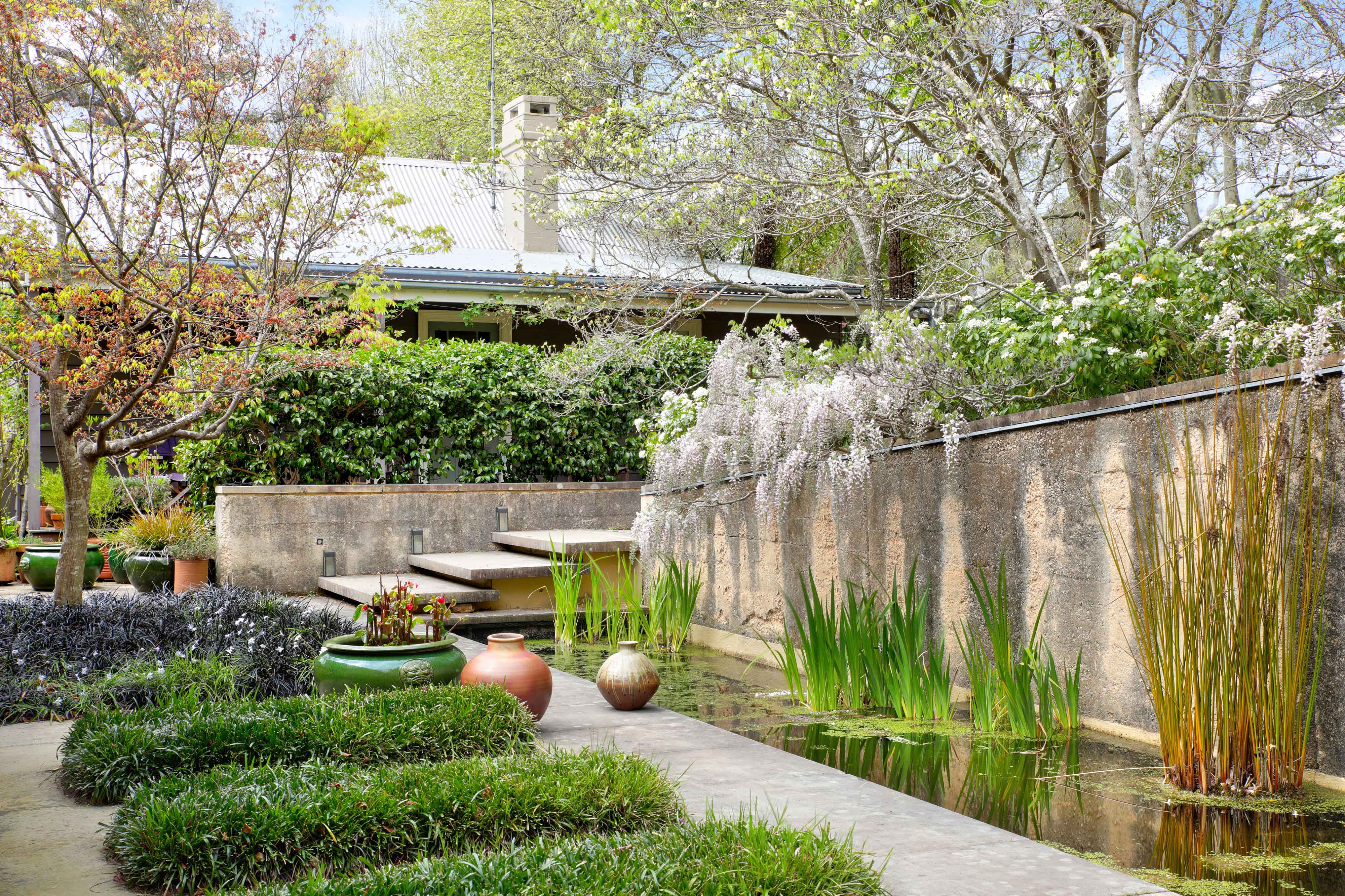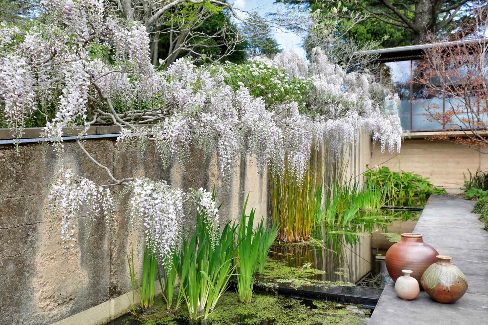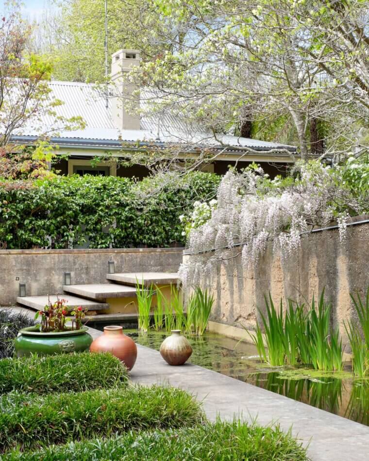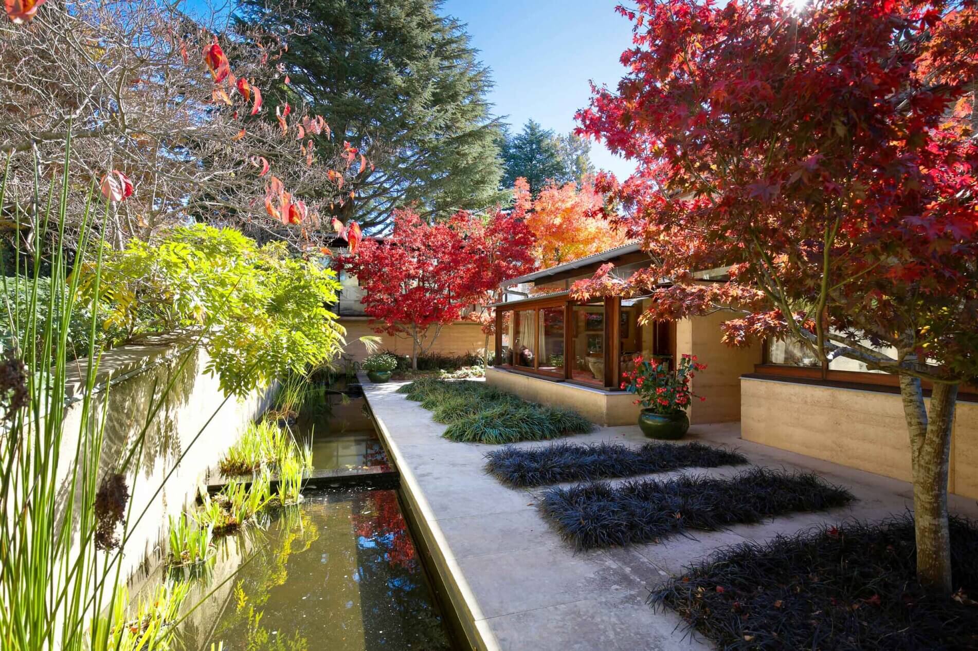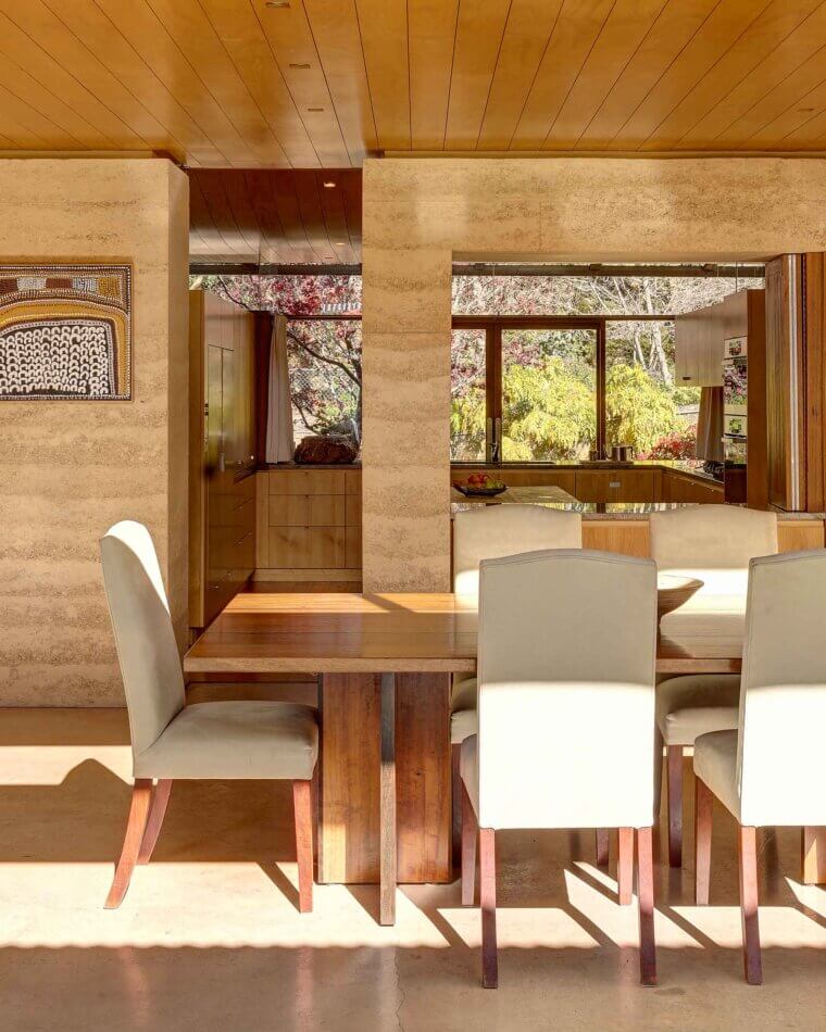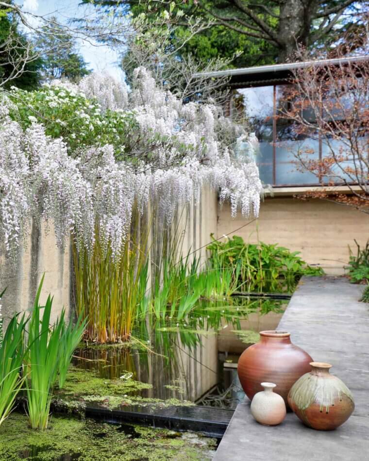 On the entry side of the house, an enclosed courtyard garden features a long, low pond that echoes the proportions of the main building. The spatial sequencing of the property’s entry and the house itself draws inspiration from the ledges and ponds of the Blue Mountains, with the experience of walking over running water becoming a central feature of the home’s early design. ‘Delightful’ is an understatement. The evening chorus of frogs, particularly the ‘bock, bock’ call of the Striped Marsh Frog, creates a serene atmosphere. The sight of abundant blossoms cascading over the main rammed earth wall evokes the serene beauty of Ryōan-ji’s garden in Japan.