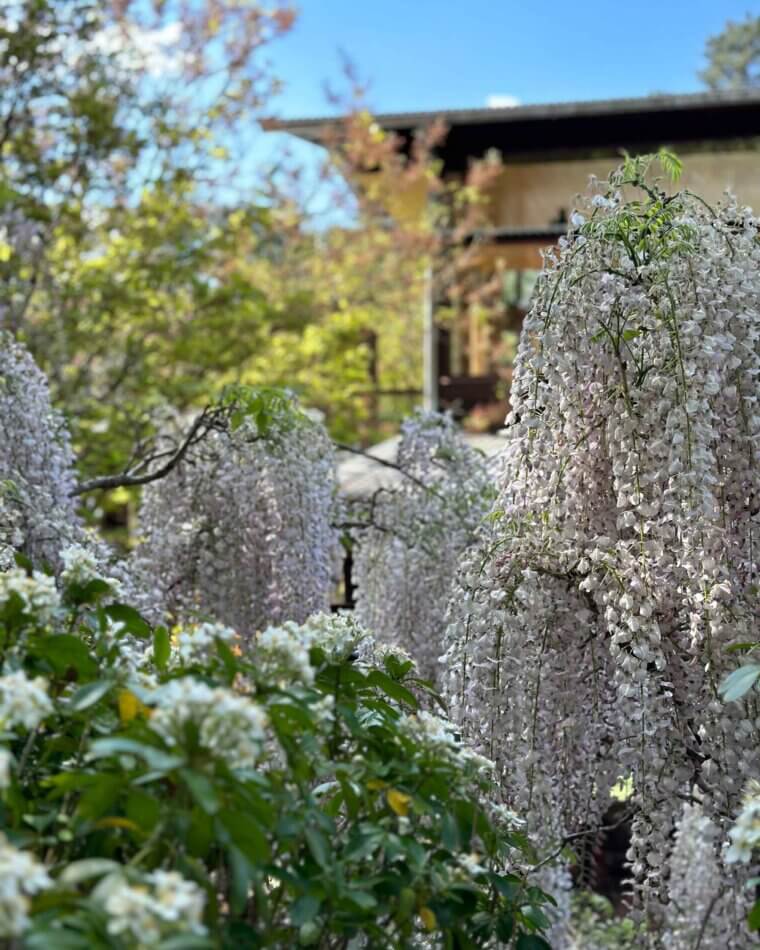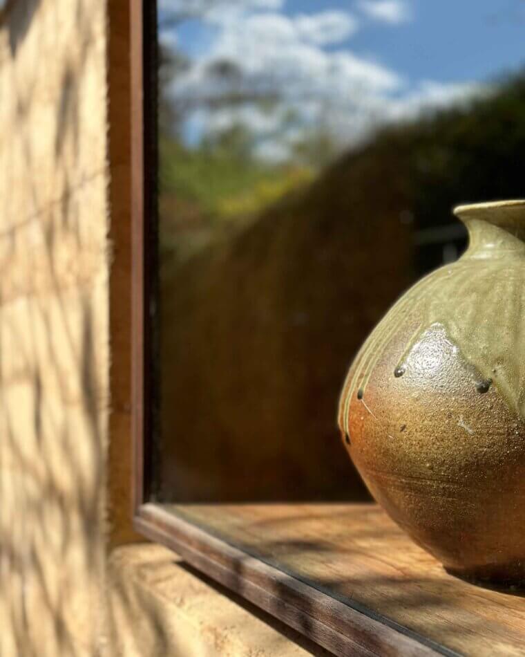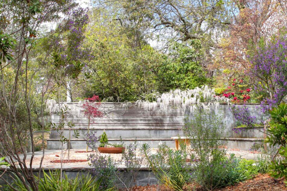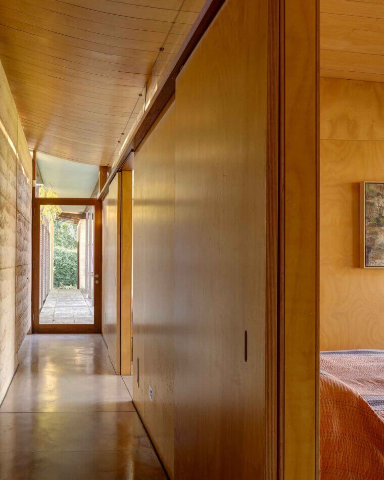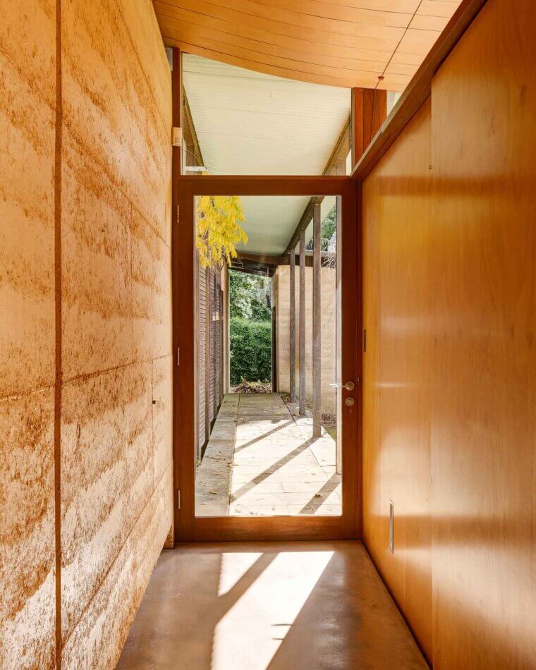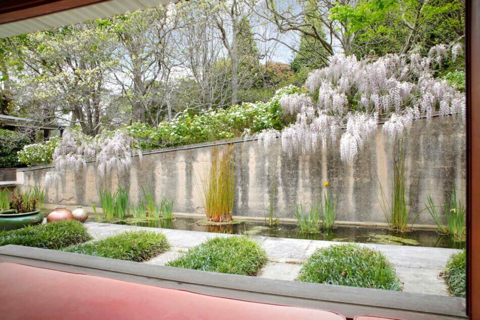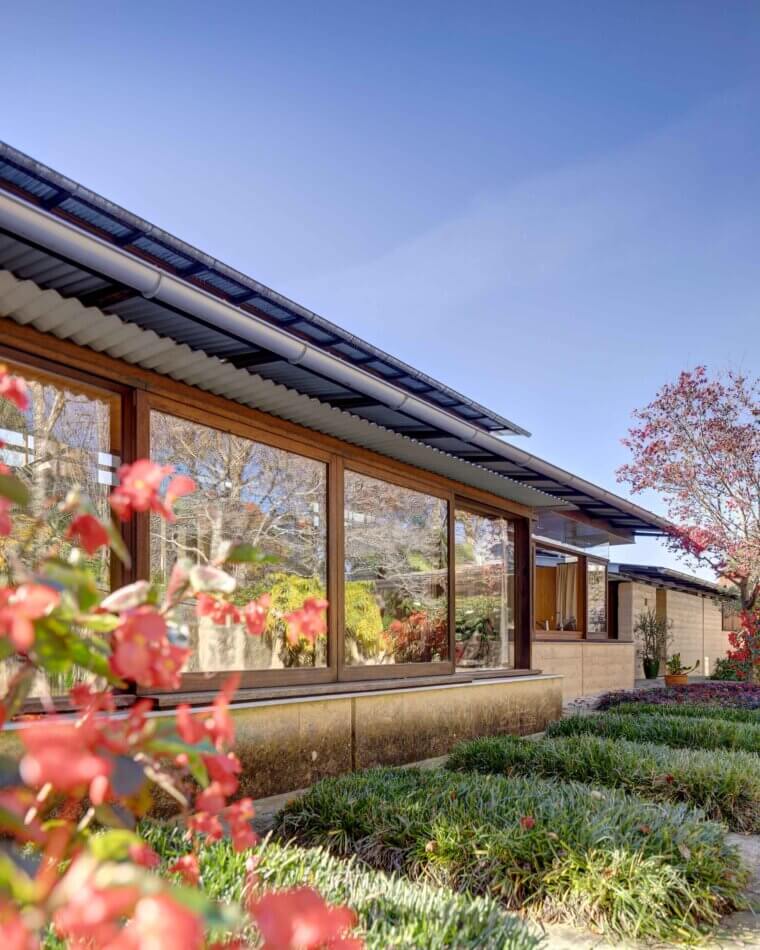 On the entry side of the house, an enclosed courtyard garden features a long, low pond that echoes the proportions of the main building. The spatial sequencing of the property’s entry and the house itself draws inspiration from the ledges and ponds of the Blue Mountains, with the experience of walking over running water becoming a central feature of the home’s early design. ‘Delightful’ is an understatement. The evening chorus of frogs, particularly the ‘bock, bock’ call of the Striped Marsh Frog, creates a serene atmosphere. The sight of abundant blossoms cascading over the main rammed earth wall evokes the serene beauty of Ryōan-ji’s garden in Japan.