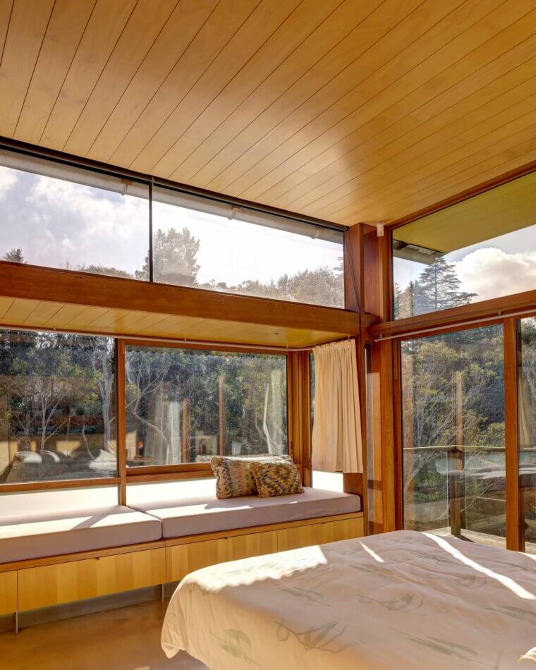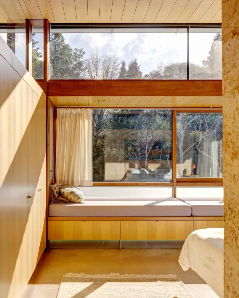 The two wings running off the central core, which contain bedrooms, can be closed off when required – in one direction lies the main bedroom, second bedroom, study and main bathroom with granite benches and Japanese-style bath; in the other, three more simple guest rooms and, beyond, a separate garden studio that opens onto a sunken outdoor space with firepit. The bedrooms in the main wing have window seats looking onto the garden; bedrooms in the guest wing open directly onto the garden.