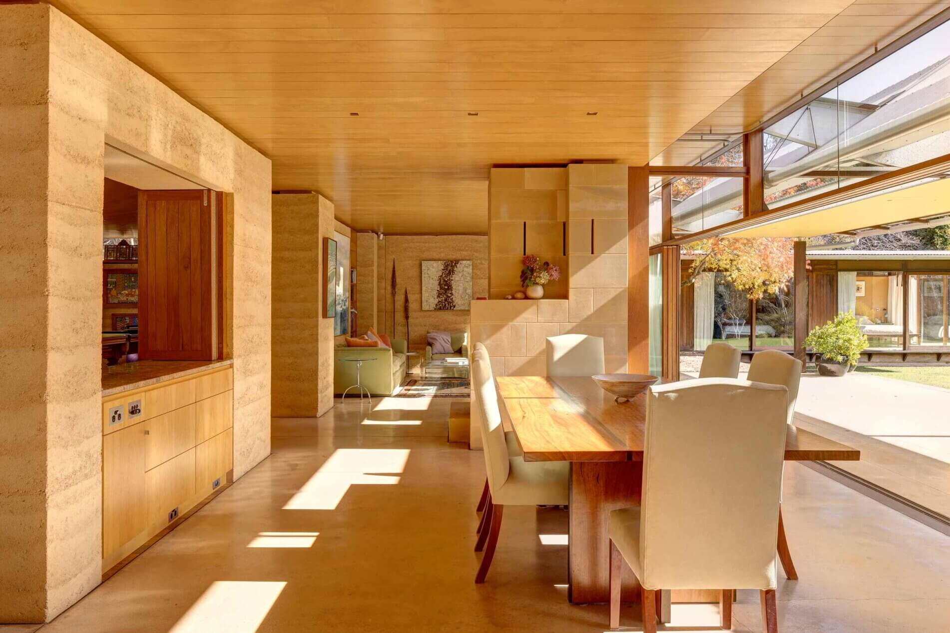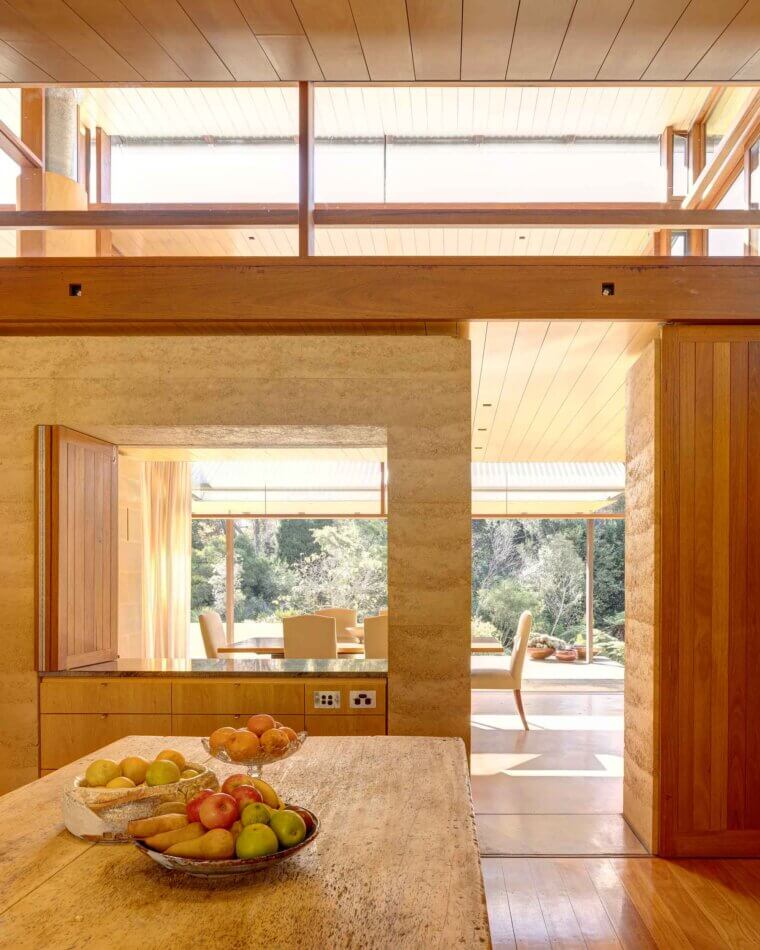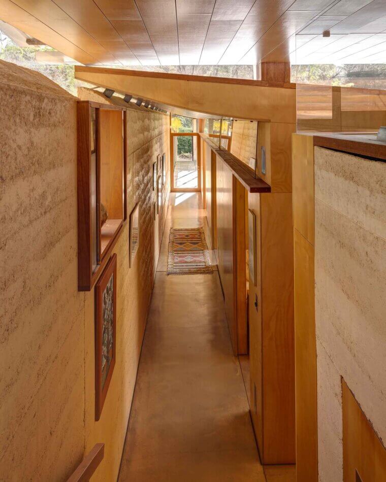 The configuration of the internal spaces created a more lateral reference to the Mountains with hidden doorways, changing ceiling levels and monolithic rammed earth blocks of different heights and mass, leading to a journey of anticipation and discovery reminiscent of a bushwalk as one moves through the house.