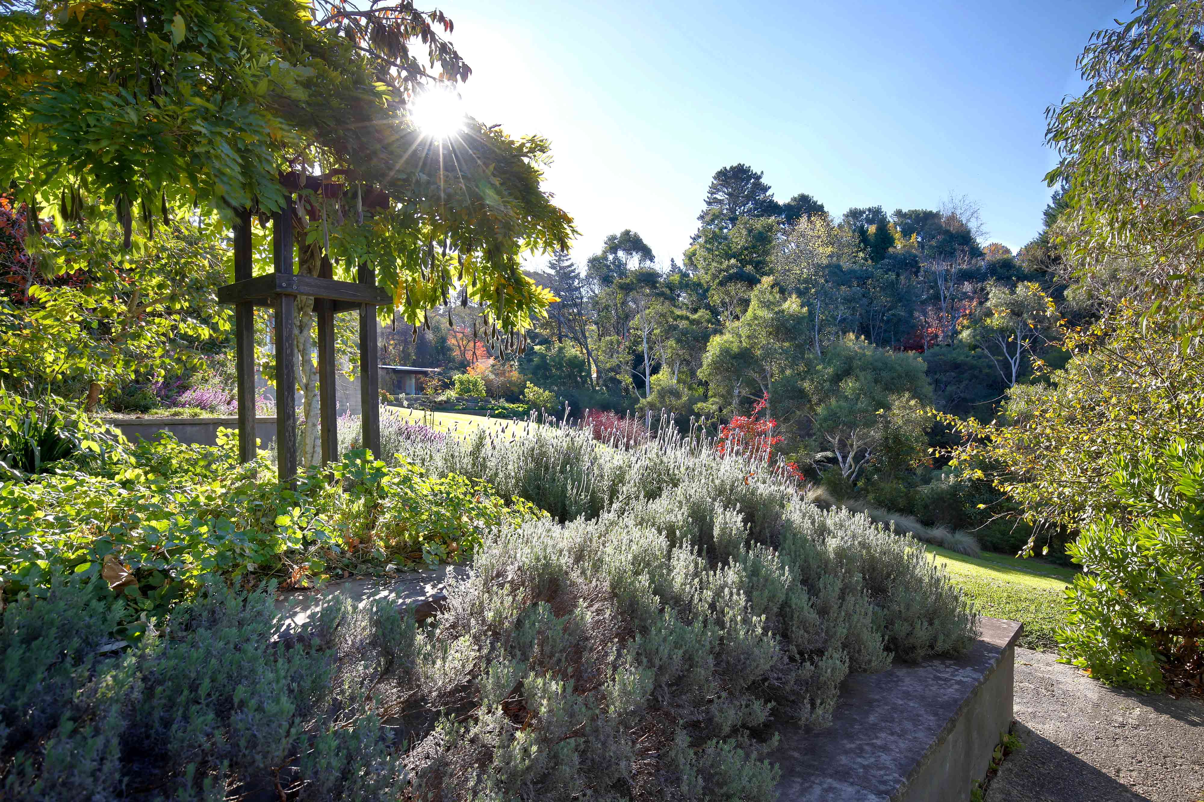 The design of the garden essentially creates two distinct areas. Closest to the house, an acre holds remnants of the original garden, along with a more formal, Mountains-style design. This includes rhododendrons, salvias, roses, lavender, and a persimmon tree, set against rolling lawns. Beyond this lies a gully, transformed through years of weeding, clearing, and thoughtful planting with the guidance of native horticultural experts. This effort has regenerated the land, creating what now resembles native bushland, complete with a mountain spring and walking tracks.