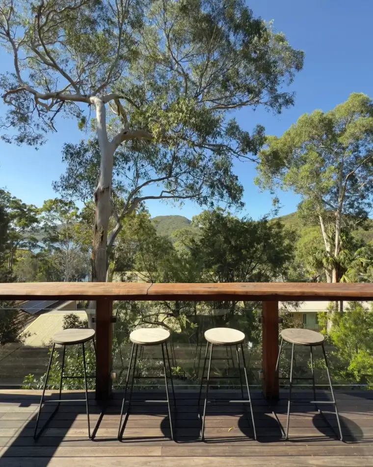 A limited palette of materials – polished concrete floors, recycled blackbutt columns and hoop pine ceilings, with a mountain ash and granite kitchen, give a certain gravitas and strength while also connecting the house with its natural surroundings.