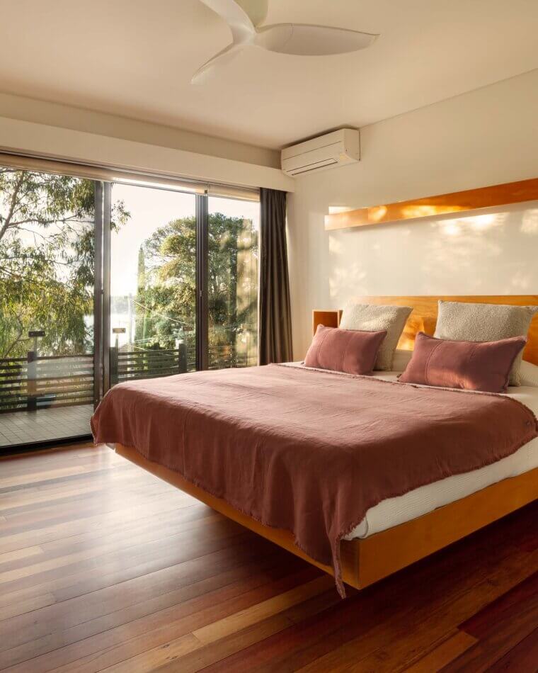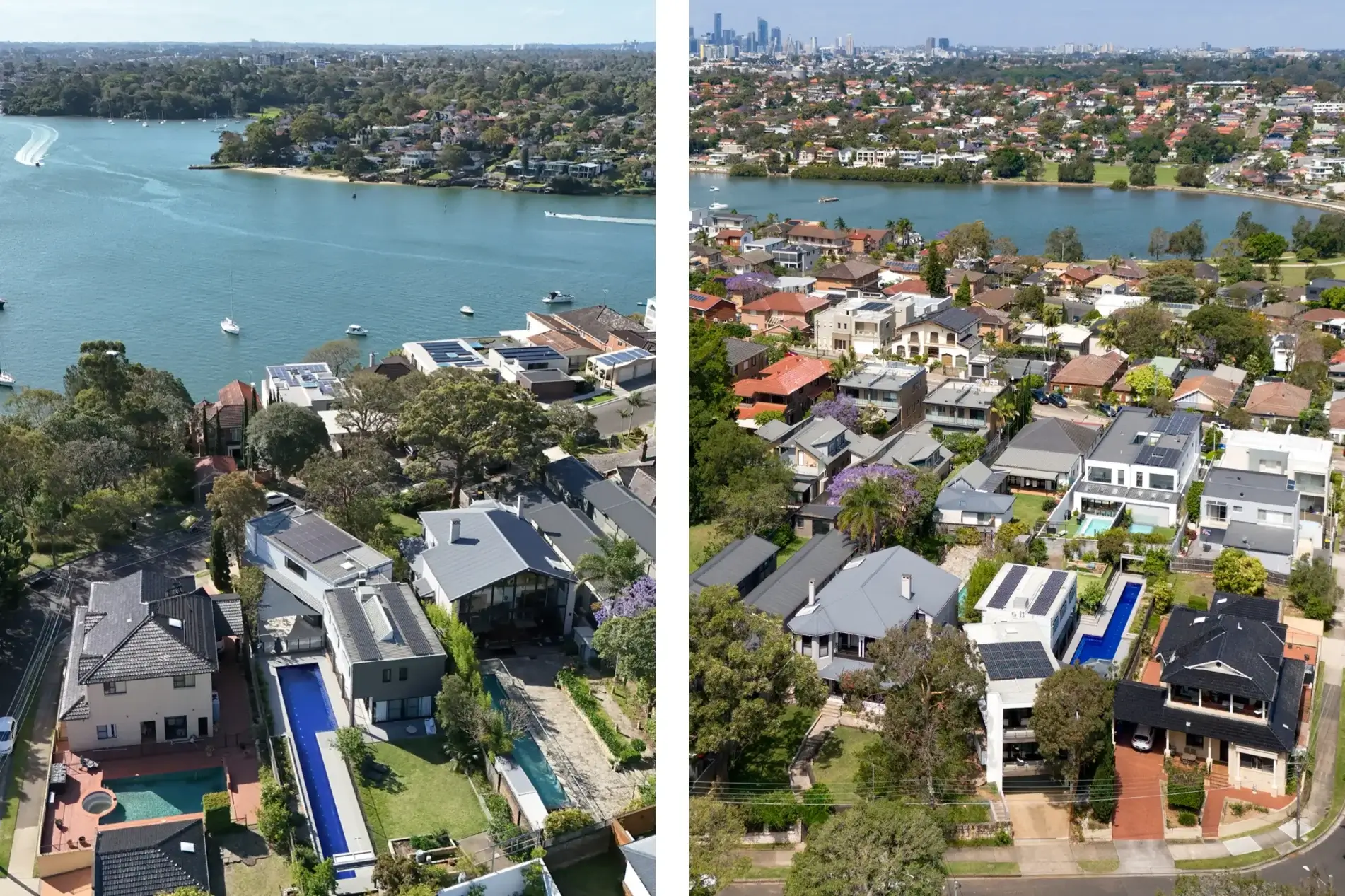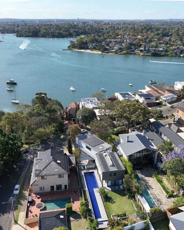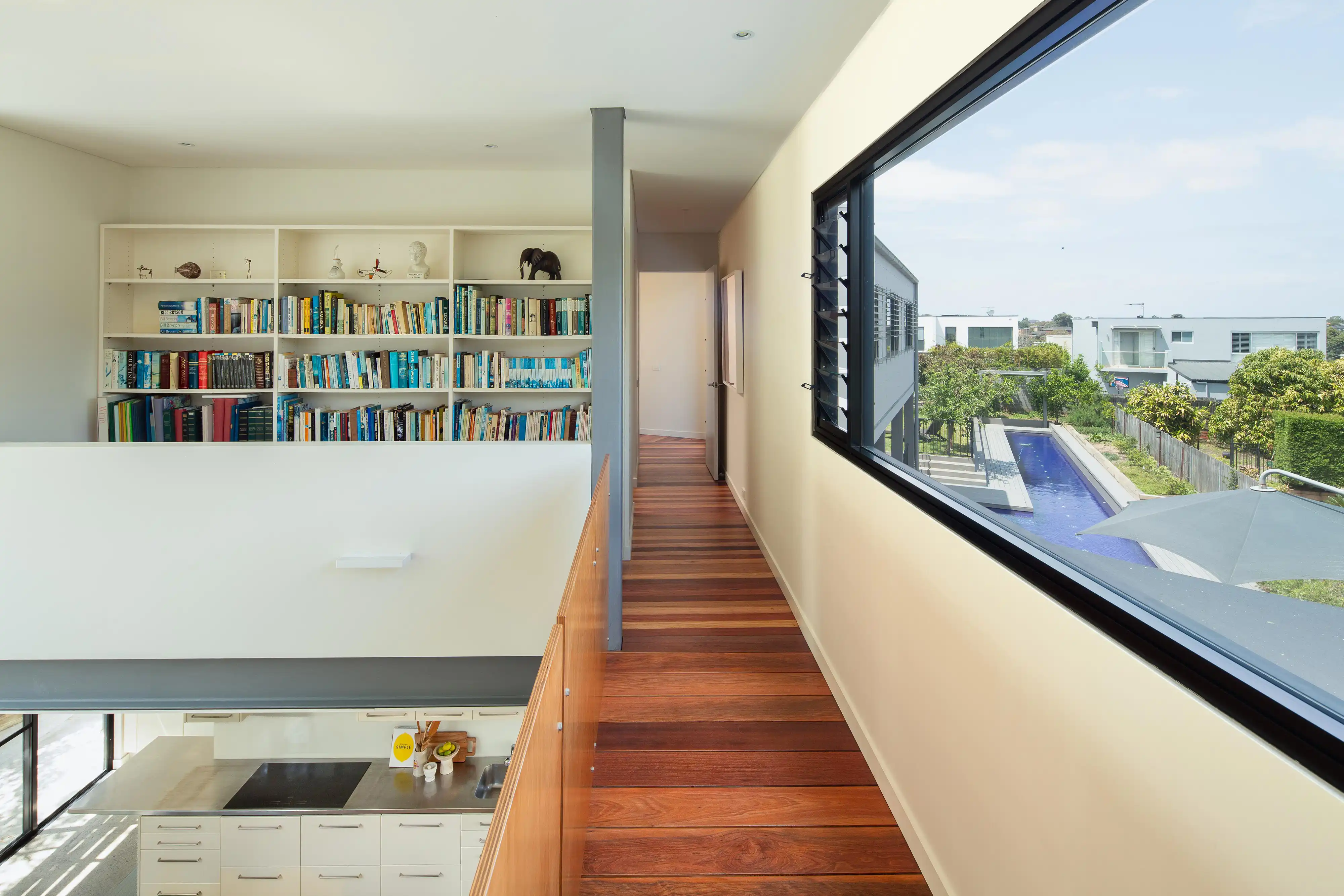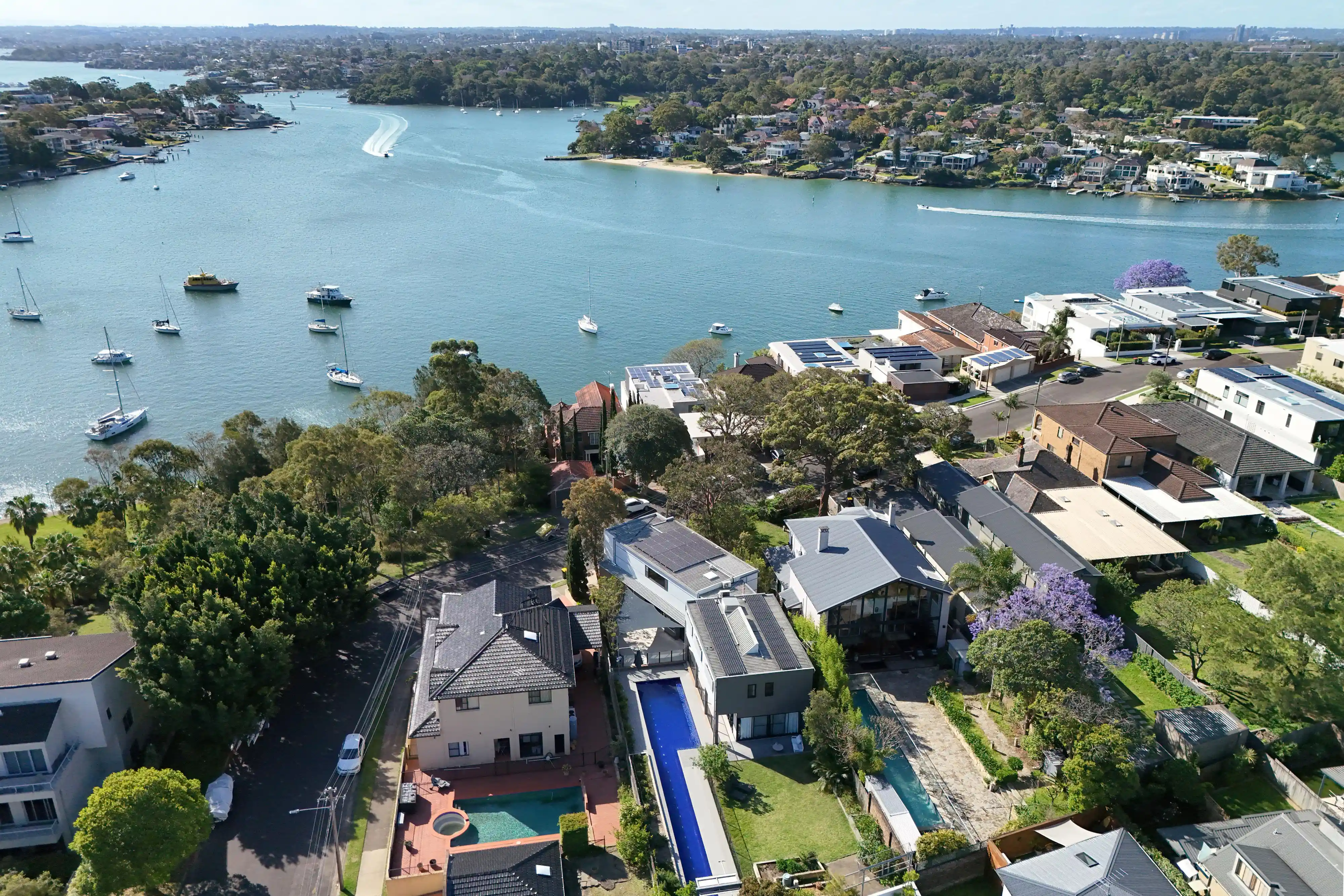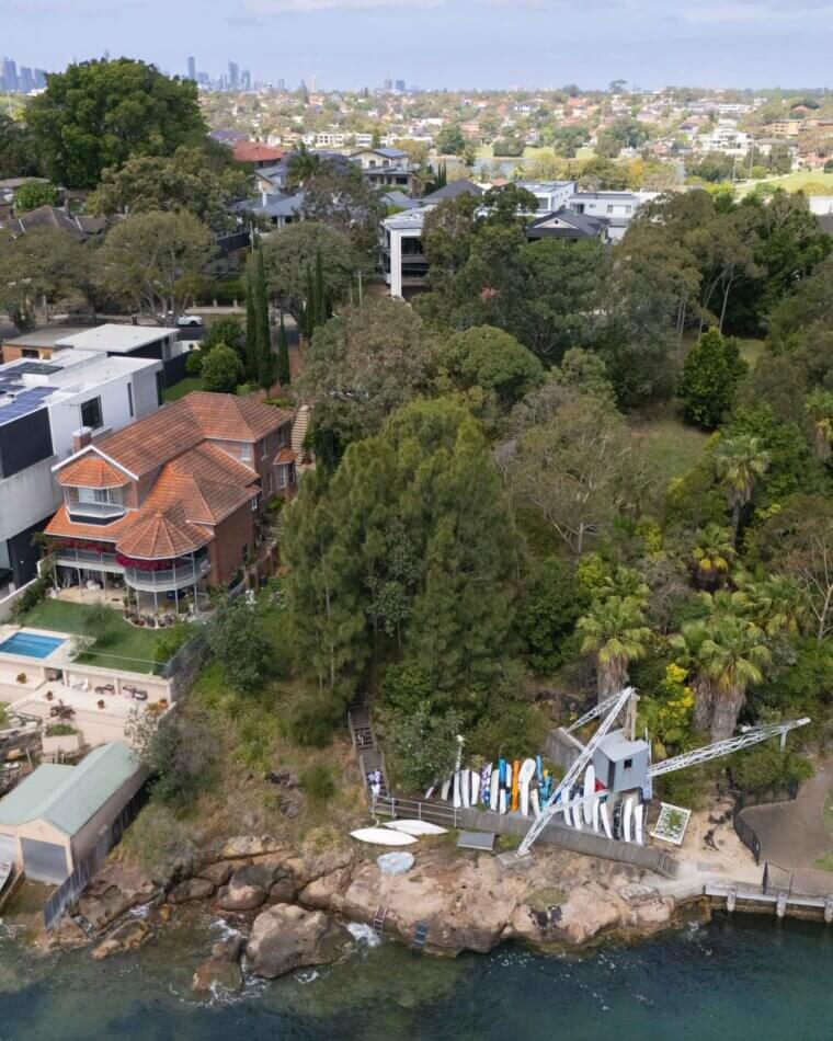 The garage is positioned at street level, with two-storey living above. The floor plan is cleverly divided by the main staircase, with the master suite—featuring elevated water views—accessed via a bridge over the living area. Family and guest spaces are thoughtfully arranged along the pool, with a family/media room opening onto the rear garden, which boasts a level lawn large enough to accommodate a marquee for special family events.