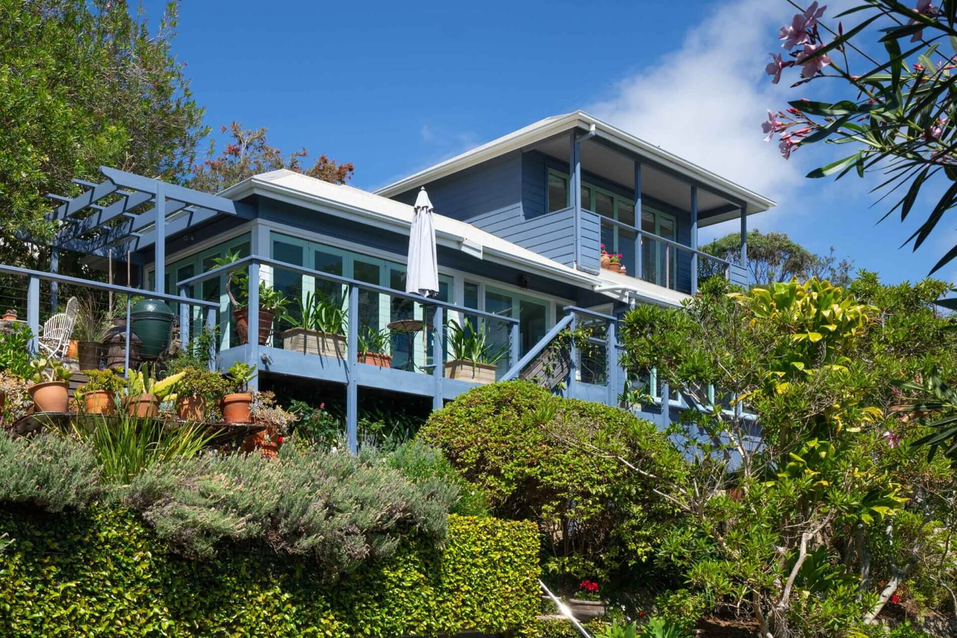 The two premier streets in Whale Beach are both north facing cul-de-sacs. Rayner Road is one of them. It’s elevated position means it is without peer when it comes to both solar access and tranquillity. Both are treasured qualities in this popular iconic world-class beach precinct, where the topography is such that a majority of homes face due east and, consequently, lose direct sun early in the day. The beauty of this particular Rayner Road position extends to complete protection from southerly winds of any hue and a vibrant garden that basks in winter sunshine and adds a decidedly Mediterranean flavour to this Australian seaside abode.