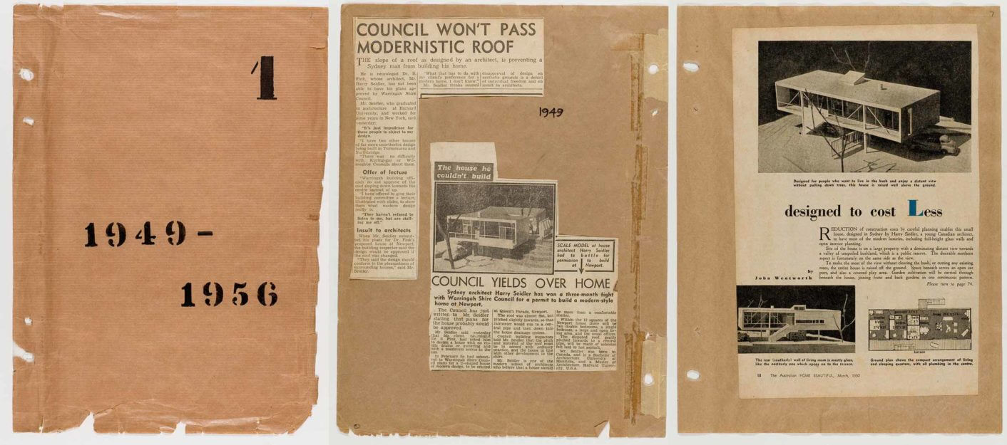 Seidler’s early scrapbooks of press cuttings, staples evident on the page and cuttings slightly skewiff, are there, too – it’s almost too easy to access the yellowing clippings of the day and get lost in contemporary stories either praising his work or chronicling his battles with local councils. A 1949 clipping has the headline ‘Council Won’t Pass Modernistic Roof’; on the same page and for the same house, another headline reads ‘Council Yields Over Home’. Look at another clipping and you’ll find that after one victory over Kuring-gai Council’s exception to a modern house he was planning in Roseville, Seidler was reported as saying, “The council should spend its money on constructing roads and playgrounds, instead of passing completely idiotic judgments on a professional man’s work.”